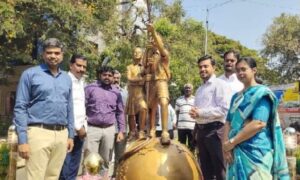 The sculpture depicts two children standing on the globe and pulling the moon them with a rope, symbolising courage and ambition. N Arul Ramesh, Chairman of The Camford International School, and Poongothai Arul Ramesh, Correspondent, were present.